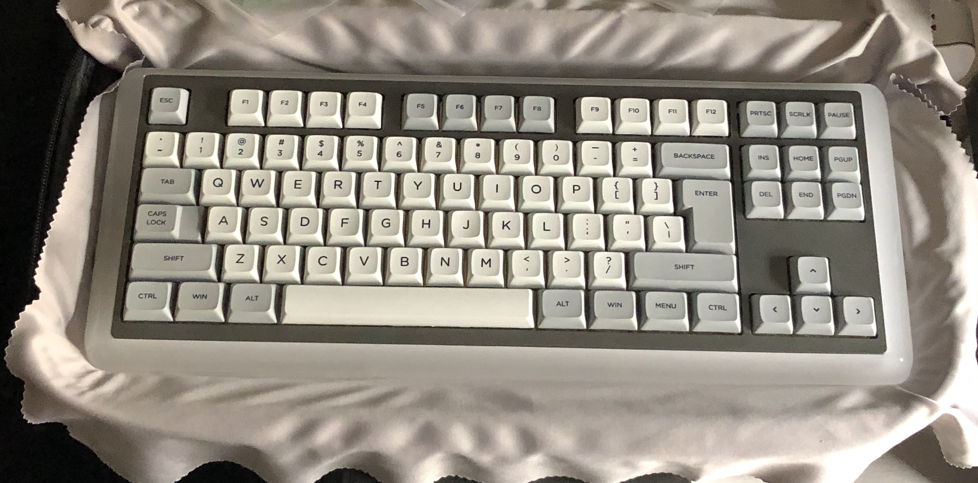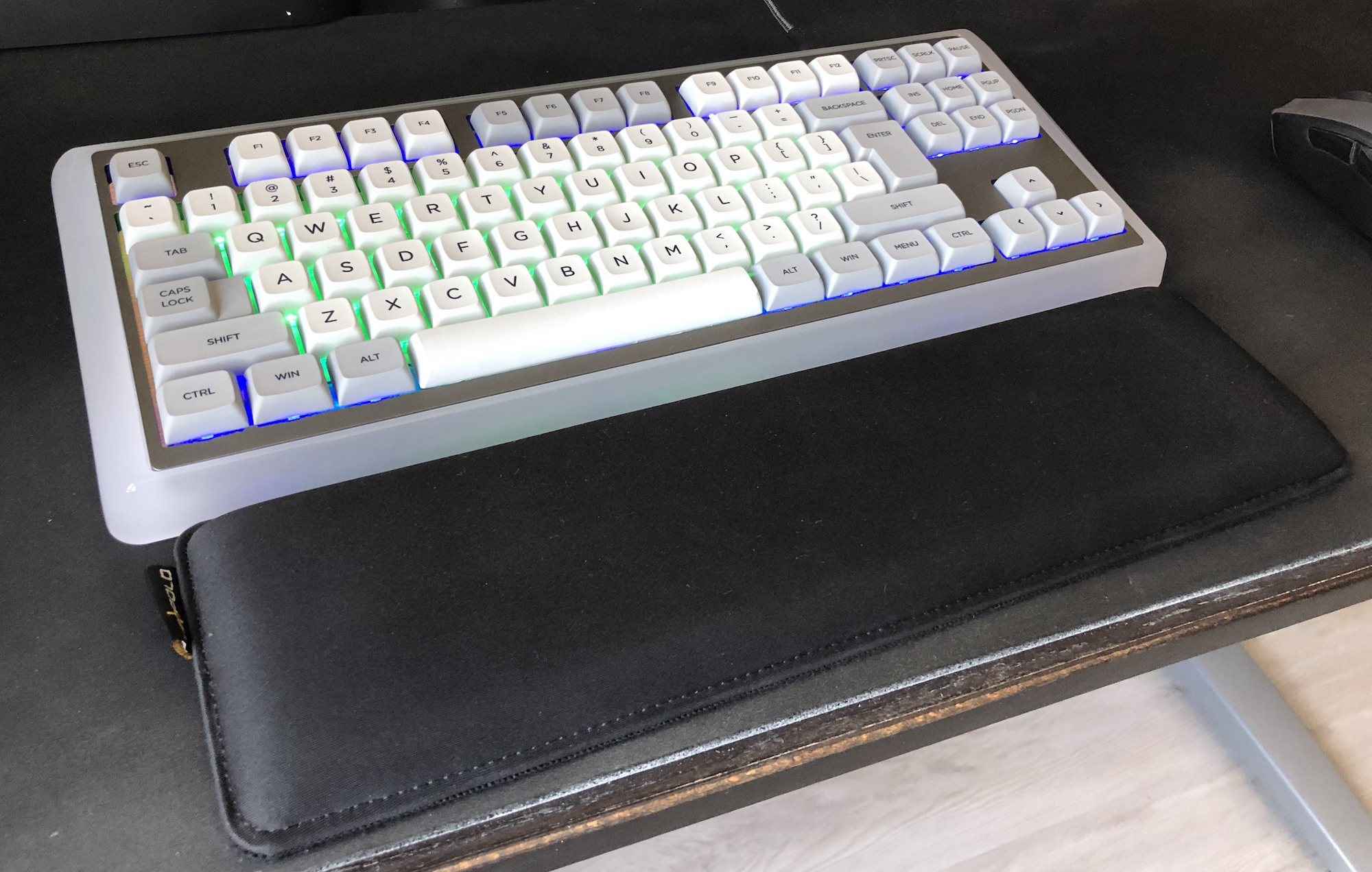 TKL с гибридной раскладкой (длинный ANSI l.shift и двухэтажный ISO enter). Свитчи Zealios v2 65g, стабы Zeal, всё смазано. PBT колпачки XDA профиля с Алика.