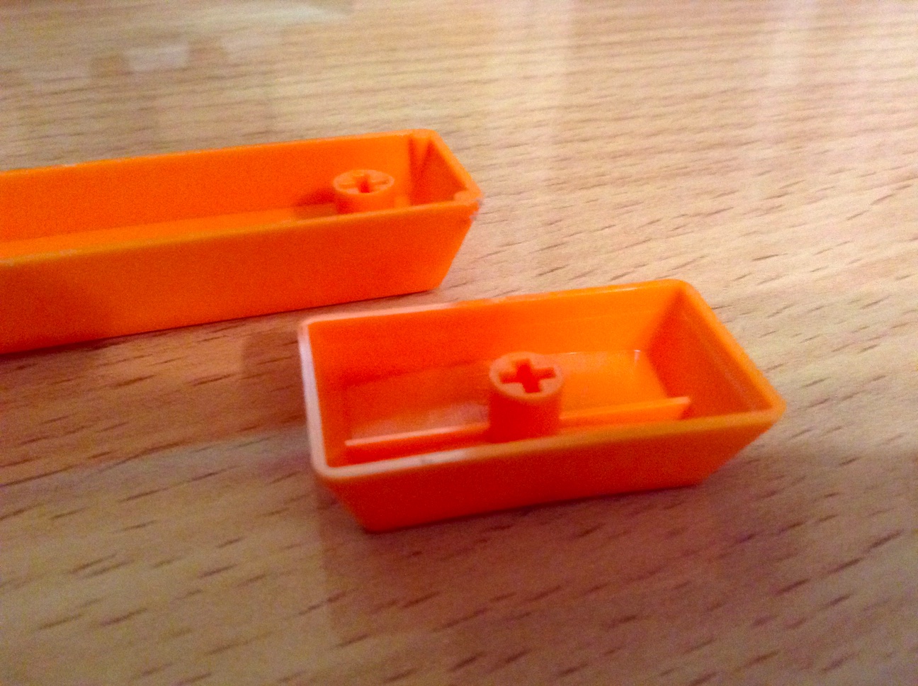 На оранжевых кейкапсах можно увидеть небольшие белые точки - Вы, наверное, о них:)