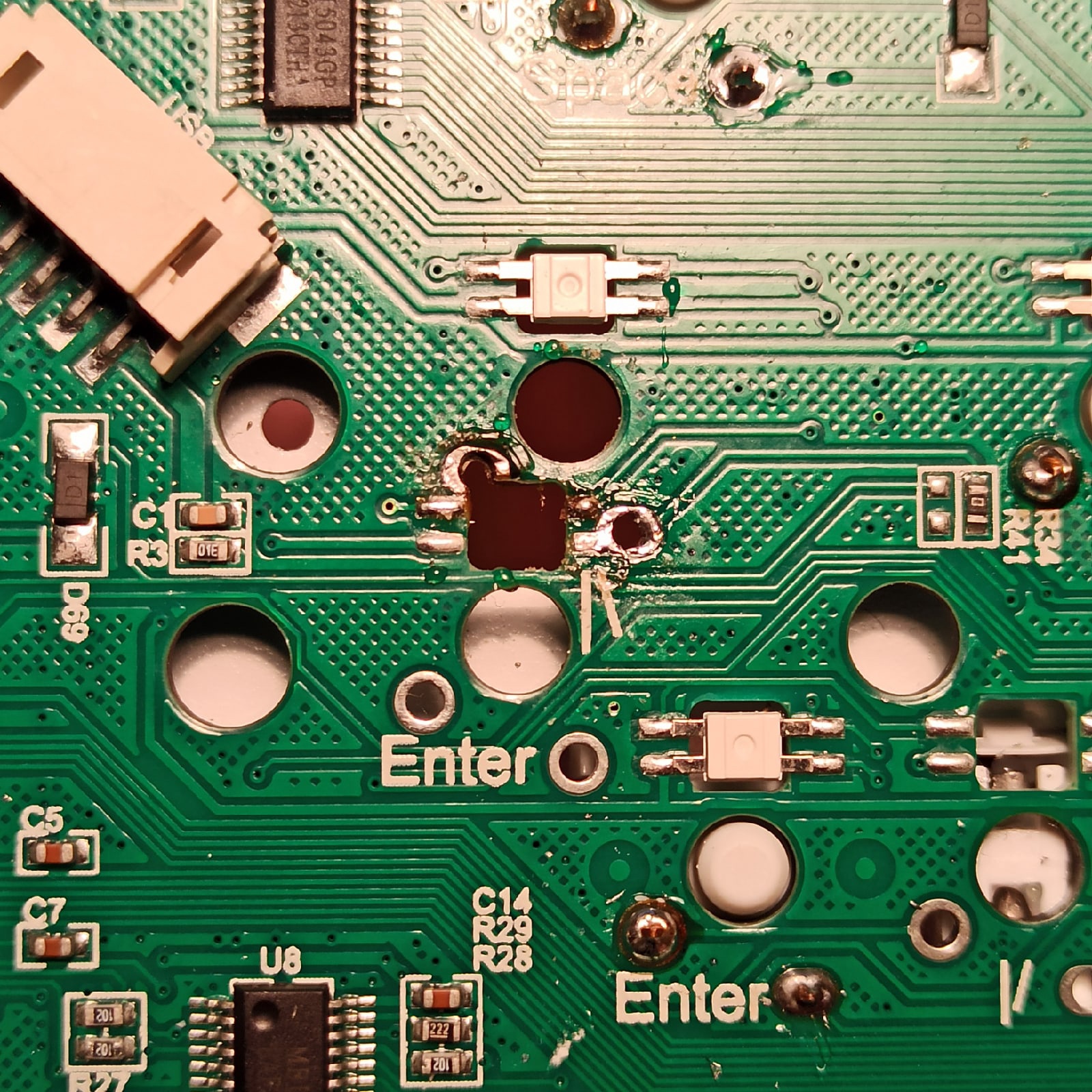 А так, нужно прозвонить один пятак с диодом, от которого идет дорожка. А второй с соседним сокетом другой клавиши из этого ряда. Если контакта нет - кинуть дорожку (проводом, медной лентой). По стоимости ремонта: