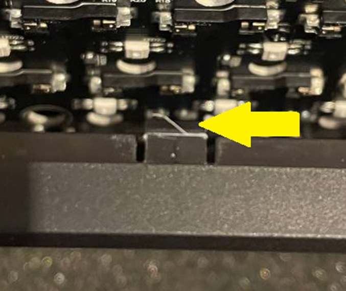 2. Аккуратно использовать защелкивающиеся соединения пластик-металл. По верхнему краю клавиатуры есть несколько защелок, которые при первом же рассоединении частично срезались о пазы металлической части корпуса. На картинке видно эту стружку.