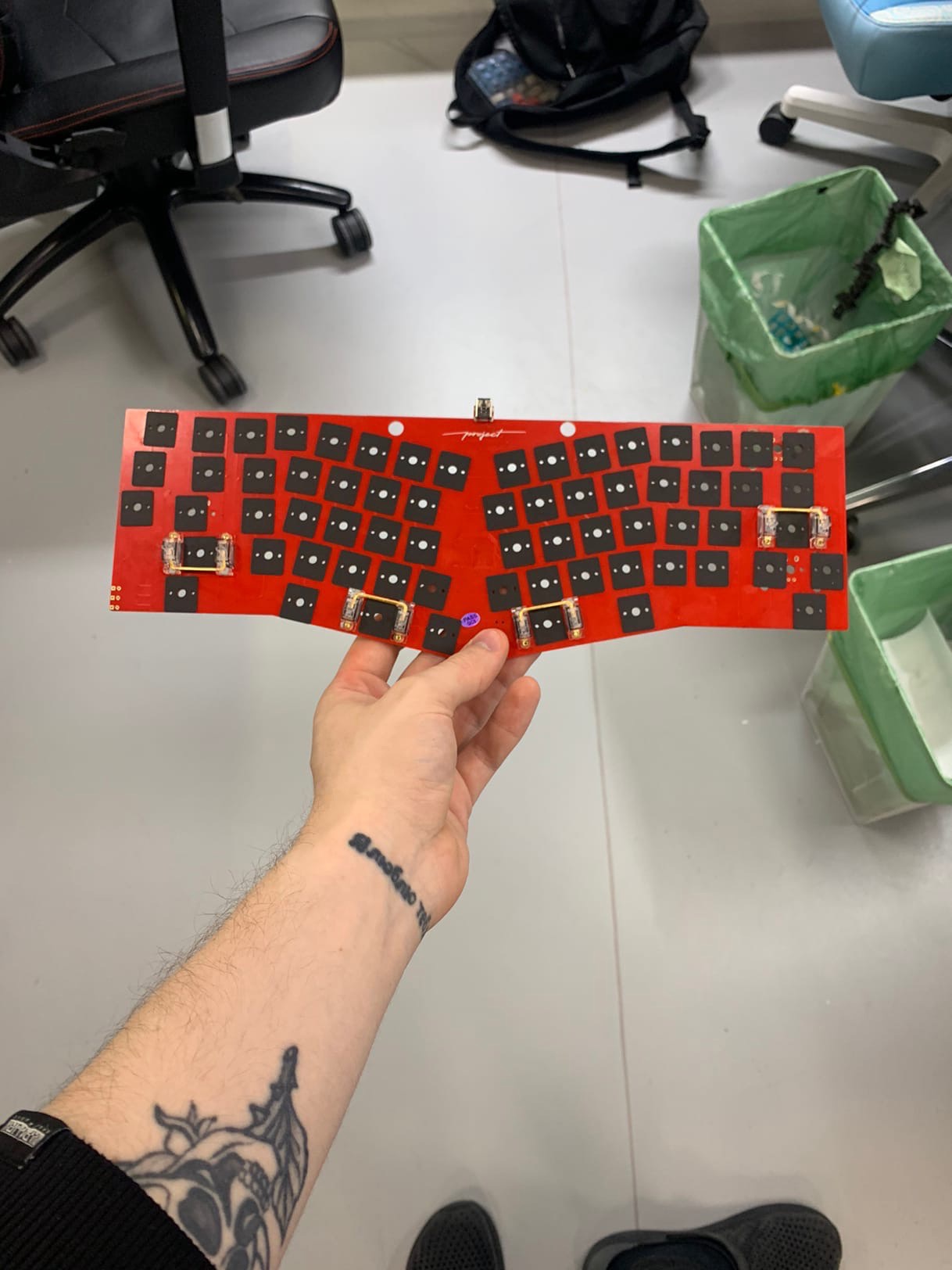 В процессе установки свитчей обнаружилось, что плейт нарисован неправильно и его выгибало в центре при установке свитчей, что мешало установить нормально свитчи и их выгибало вместе с плейтом. Мой инженерий мозг стал работать на 100% и искать пути решения данного конфуза катастрофы. Меня осенило, можно разрезать центральную часть плейта и убрать напряжение (это на удивление помогло). Разрез я произвел шедеврально и очень аккуратно как варвар паяльником. В итоге я собрал алису всего за 8 часов танцев с бубном.