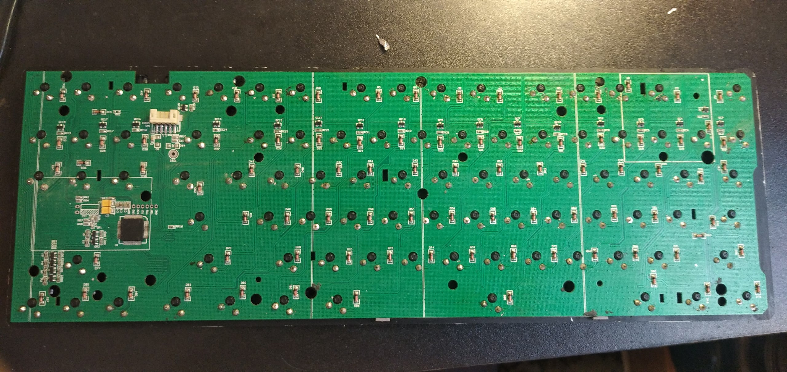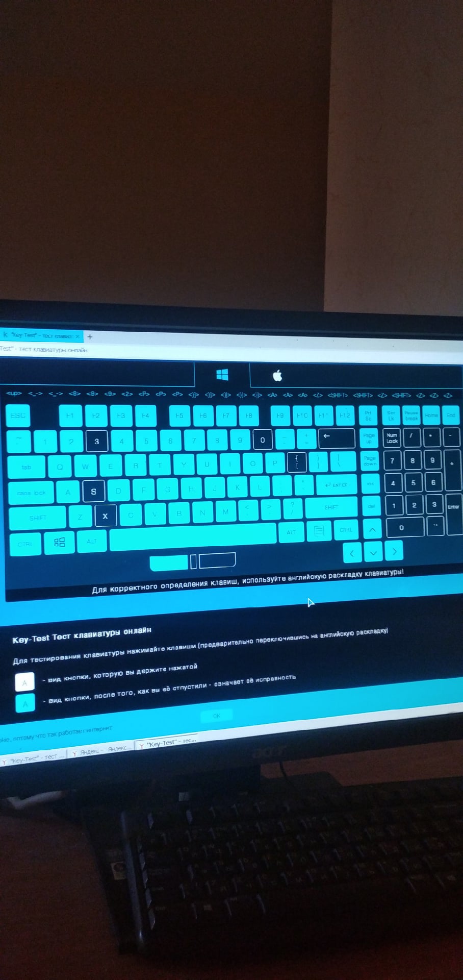 Вот, сообственно, сама плата, вид сверху, и результат key-test, где показано какие клавиши не работают, ну и апдейт, я почистил плату спиртом, и заработал весь нижний ряд, по итогу не работают только 6 клавиш: S, X, ,3, 0, Backspace, {. Как то так, фото платы прикрепил, надеюсь что, что-то да и найдёте