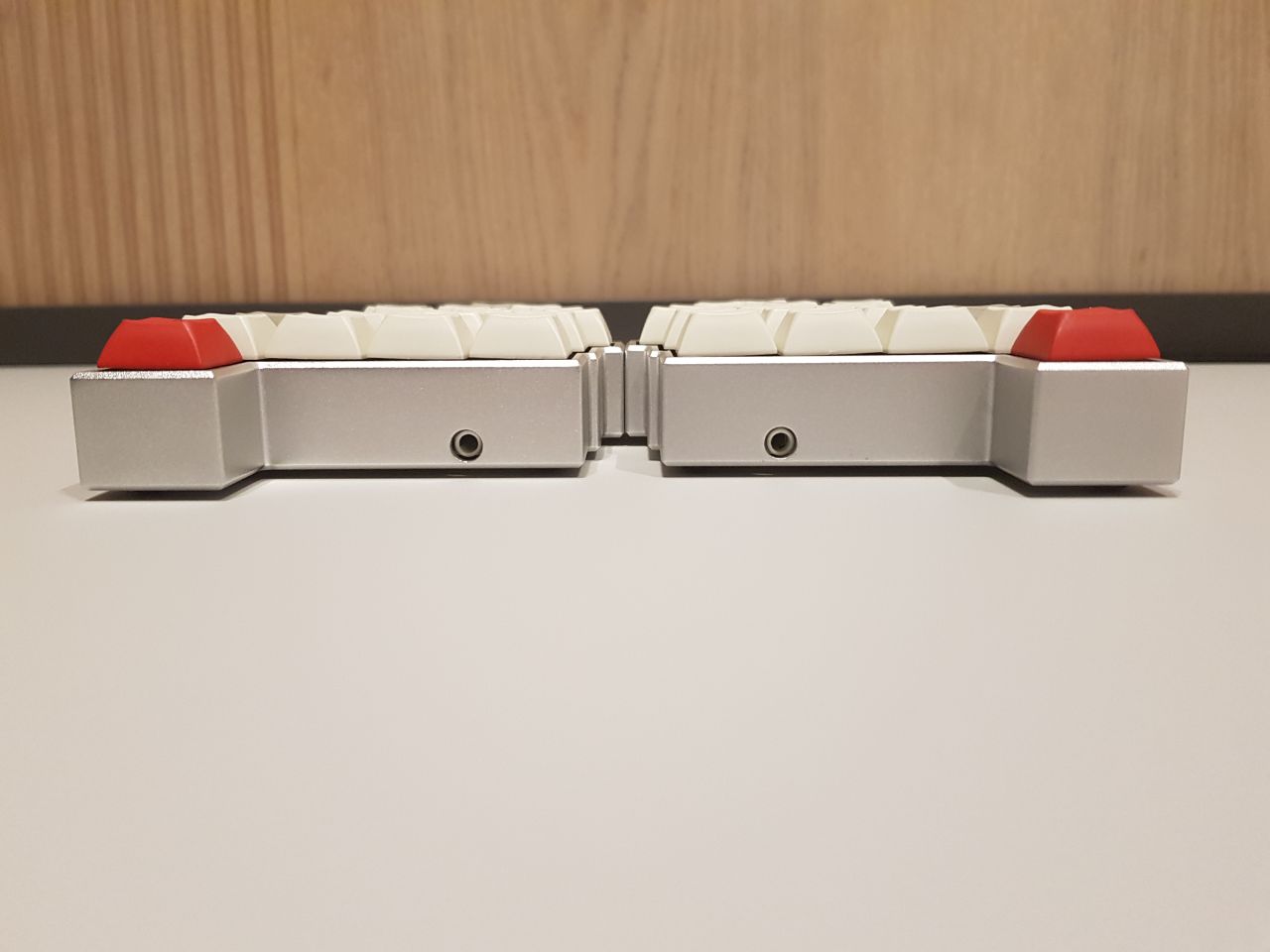 • есть отверстия для проводного подключения между половинками, но увы, либо плата стоит далеко, либо отверстия меньше чем нужно, ни одним кабелем из своих подцепить не смог, нужно подбирать кабель или расширять отверстия