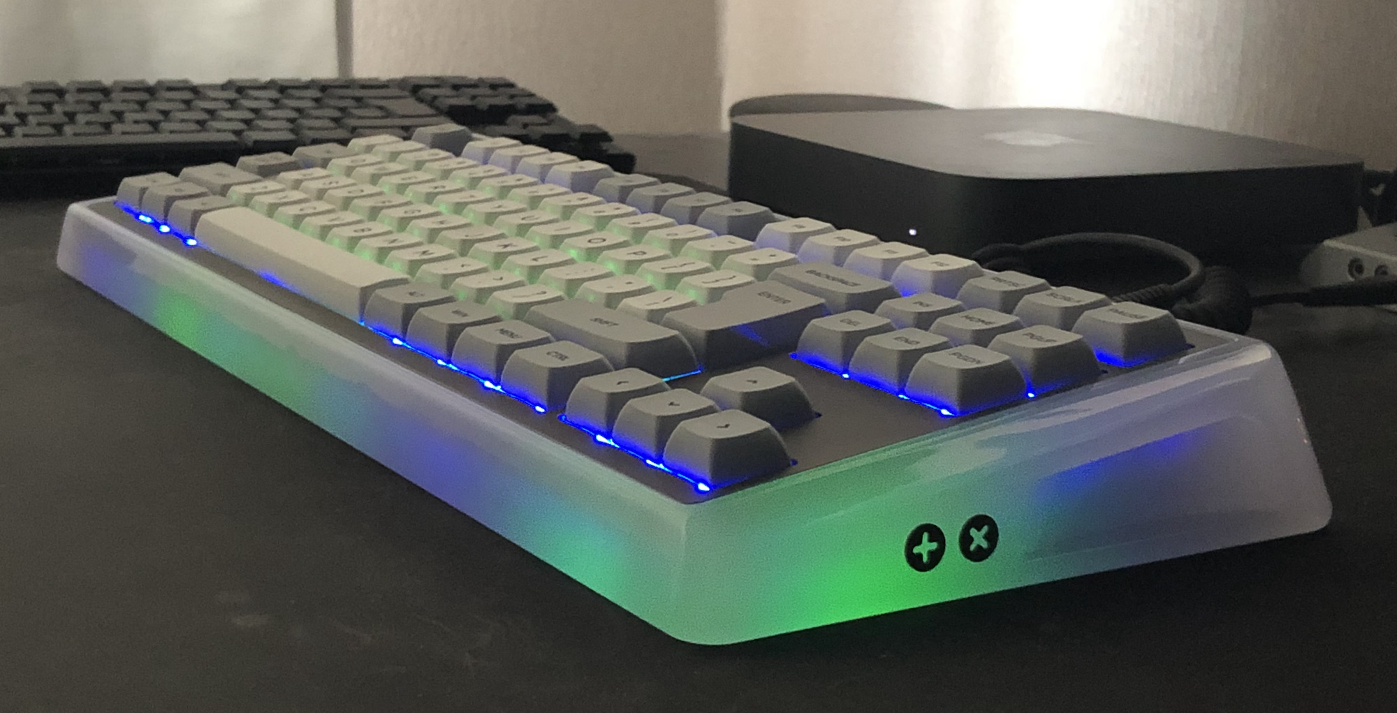 TKL с гибридной раскладкой (длинный ANSI l.shift и двухэтажный ISO enter). Свитчи Zealios v2 65g, стабы Zeal, всё смазано. PBT колпачки XDA профиля с Алика.