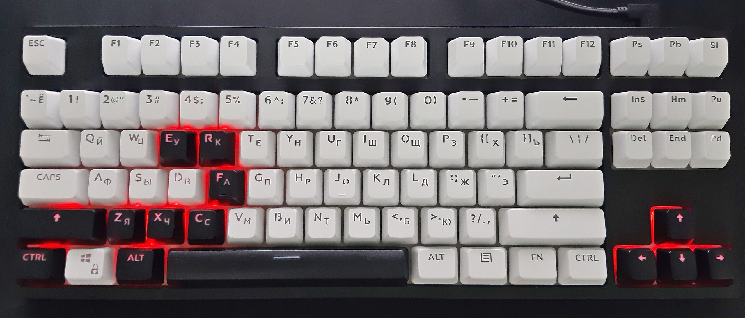 Черные кейкапы заменил на белые, оставив черные только на нужных мне клавишах (клавиши которые часто используются в играх - мне так удобно).