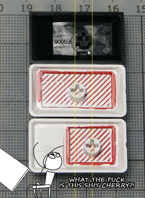 для капслока есть 3 возможных положения стэма - по центру, со смещением 19 мм от края и, как на моей G80-3000 - 21 мм от края. Я не очень понял гуглоперевод, но, похоже, это уникальное положение штырька для клавиатуры черри. Есть ли у кого-нибудь ещё колпачки со смещением? Кстати, это называется "stepped caps lock".